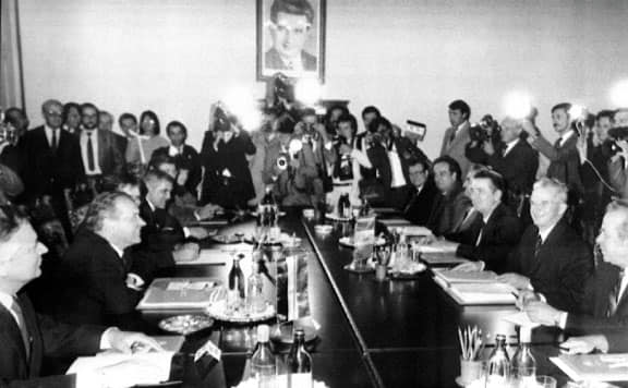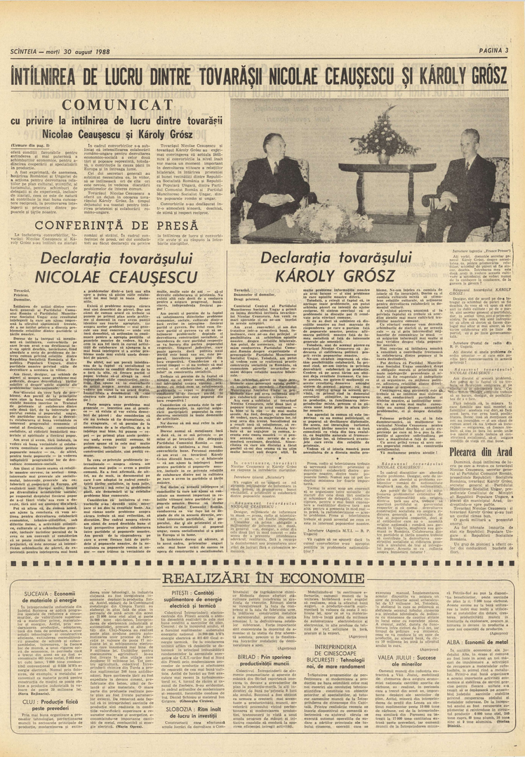 La 28 august 1988, Aradul a fost scena întâlnirii dintre Nicolae Ceaușescu, președintele României, și Károly Grósz, prim-ministrul Ungariei și secretar general al Partidului Muncitoresc Ungar, una dintre întrevederile diplomatice care se doreau importante în ultimul deceniu comunist.